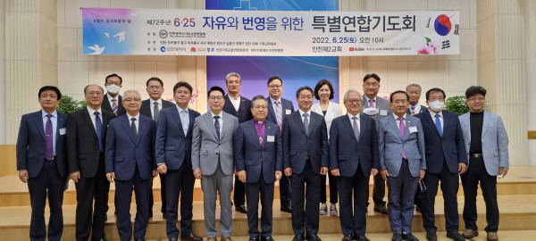 인천광역시기독교총연합회(총회장 윤보환 감독)는 지난 6월 25일 인천제2교회(담임 노원석 목사)에서 자유와 번영을 위한 제72주년 6.25 특별연합기도회를 갖고 한반도의 평화와 나라 안정 및 인천광역시를 위해 기도하는 시간을 가졌다.