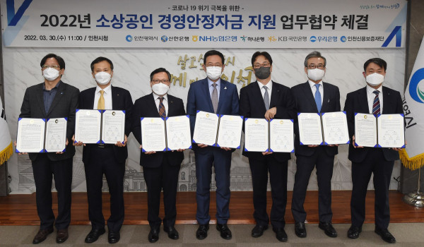 박남춘 인천광역시장이 지난 3월 30일 시청 대접견실에서 열린 '2022년 소상공인 경영안정자금 지원 업무협약 체결식'에서 기념촬영을 하고 있다. (왼쪽부터 우리은행 이범용 부평영업그룹장, 국민은행 정문철 전무, 농협은행 임동순 부행장, 박남춘 인천시장, 신한은행 박성현 부행장, 인천신용보증재단 조현석 이사장, 하나은행 성영수 부행장)