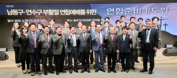 남동구기독교연합회(회장 송순자 목사, 이하 남기련)와 연수구기독교연합회(회장 김의철 목사, 이하 연기련)는 지난 3월 20일(목) 오전 11시 송도가나안교회(담임 김의철 목사)에서 인기총 부활절새벽연합예배를 위한 연합준비기도회를 갖고 부활절연합예배의 성공 및 나라와 민족을 위해 기도하는 시간을 가졌다.