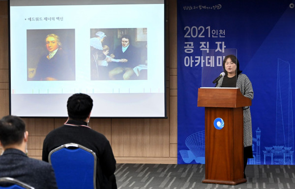 지난 3월 16일 시청 공감회의실에서 실시간 모바일 강연과 병행해 열린 '인천 공직자 아카데미'에서 김서형 러시아 빅히스토리 유라시아센터 연구교수가 '6가지 백신이 세계사를 바꾸었다'를 주제로 강연을 하고 있다.
